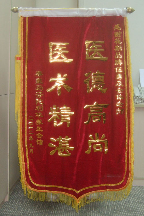 2012年10月30日,秦皇島“芬陀利華養(yǎng)生會(huì)館”給花期品牌管理中心送來(lái)了一面寫(xiě)有“醫(yī)德高尚、醫(yī)術(shù)精湛”的錦旗,感謝花期品牌的伍勇老師及花期全體工作人員。